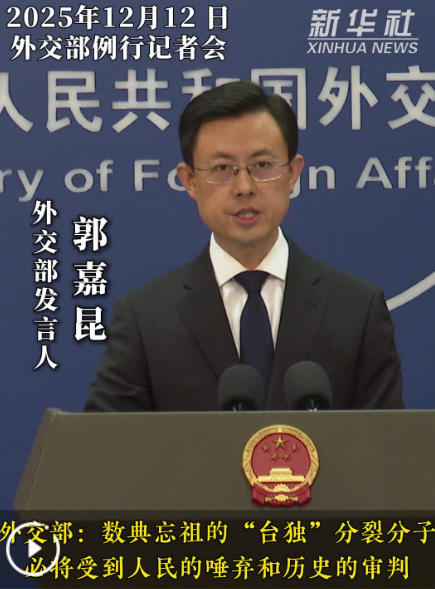 新华社北京12月12日电(记者曹嘉玥、邵艺博)外交部发言人郭嘉昆12月12日在例行记者会上表示,日本曾经侵占并对台湾殖民统治50年,犯下的罪行罄竹难书。面对一桩桩惨案、一道道铁证,民进党当局不仅视而不见,反而公然美化日本殖民统治,用所谓“终战”虚化历史真相,只字不提抗战胜利和台湾光复,将日本对台殖民压迫美化为“建设”与“贡献”,背弃民族、媚日卖台,甘做复活日本军国主义的帮凶和棋子。