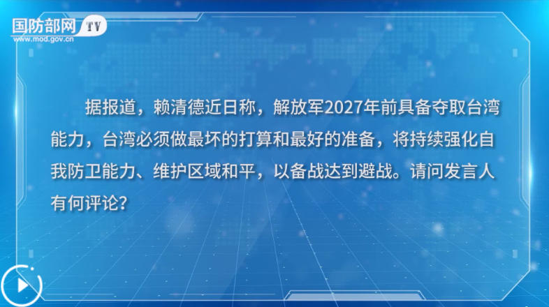 记者:据报道,赖清德近日称,解放军2027年前具备夺取台湾能力,台湾必须做最坏的打算和最好的准备,将持续强化自我防卫能力、维护区域和平,以备战达到避战。请问发言人有何评论?